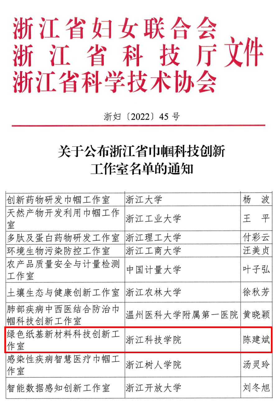 近日,为深入贯彻落实省第十五次党代会和全省科技创新大会精神,持续深化科技创新巾帼行动,省妇联、省科技厅、省科协联合开展了浙江省巾帼科技创新工作室评选活动。环资学院陈建斌教授级高工领衔的绿色纸基新材料科技创新工作室榜上有名。