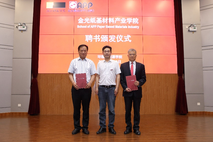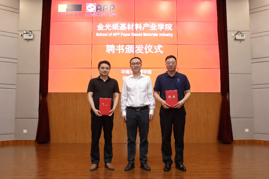 特色班开班仪式上,单胜道副校长为江俊德总经理和苗文峰经理分别颁发产业学院副理事长和副院长聘书,环资学院书记李俊为企业导师颁发兼职教师聘书。苗文峰经理现场与学生签订学生培养协议,与会领导为学生颁发金光纸基材料产业学院特色班学员证。