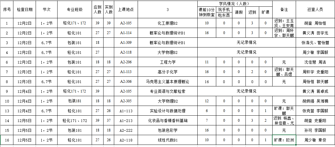 环资学院第十四周教风学风督查通报