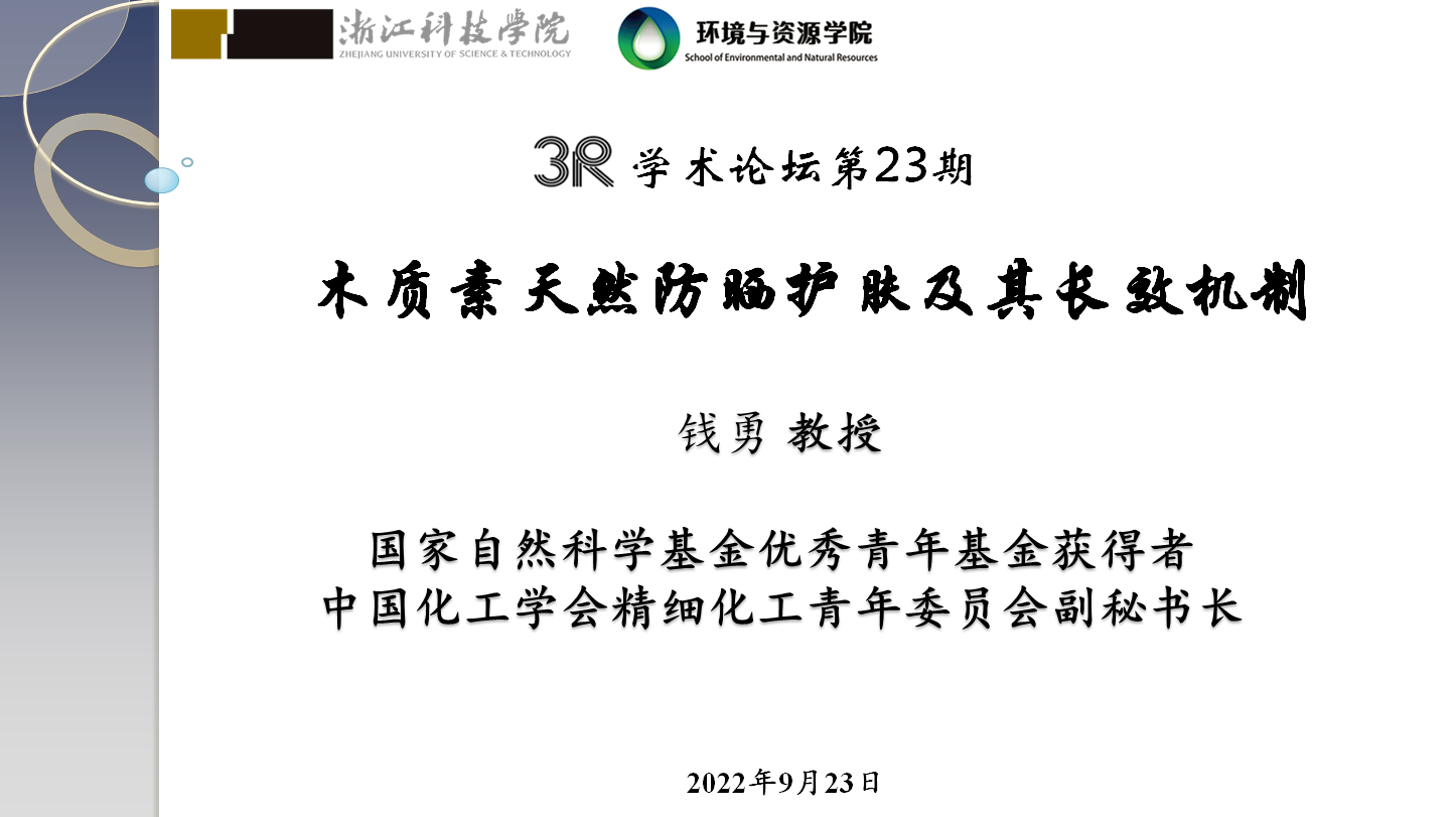 2022年9月23日下午,国家自然科学基金优秀青年基金获得者、中国化工学会精细化工青年委员会副秘书长华南理工大学博士生导师钱勇教授到访环境与资源学院,并作题为“木质素天然防晒护肤及其长效机制”的学术报告,报告会由胡志军副院长主持,学院专业教师和硕士研究生等二十余人参加了报告会。