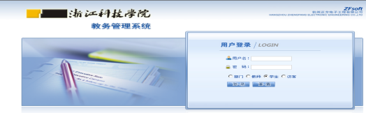1、登陆教务管理系统主页:在浏览器中输入,出现登陆界面(如下图)。选择学生(默认),用户名称为:学生学号,用户口令为自己设定的密码,(如有遗忘请到所在学院教务员处查询),登陆系统。校外访问须先认证。